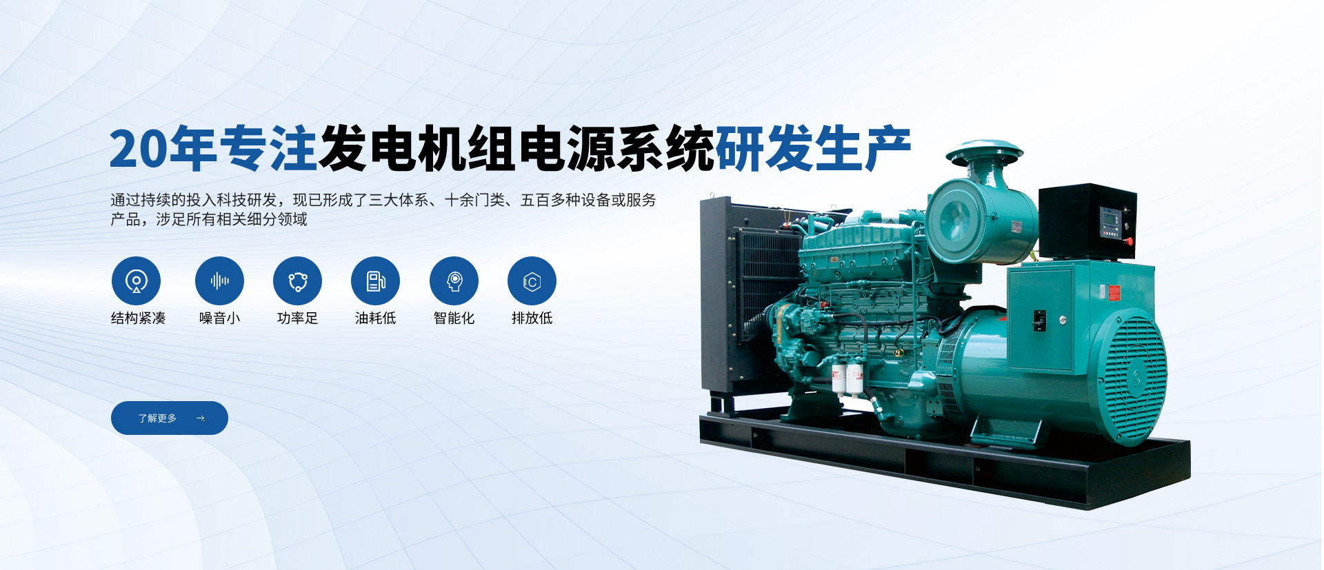 公司一直專注于高品質(zhì)發(fā)電機(jī)組及配套設(shè)備的研發(fā)、生產(chǎn)、銷售和售后服務(wù),致力于為用戶提供完美的產(chǎn)品和服務(wù)。從全球知名配套廠商優(yōu)選零部件及組件,優(yōu)勢(shì)組合,打造名牌發(fā)電機(jī)組產(chǎn)品。公司在全國(guó)設(shè)立多處銷售服務(wù)網(wǎng)點(diǎn),體系遍布全國(guó)大中城市。